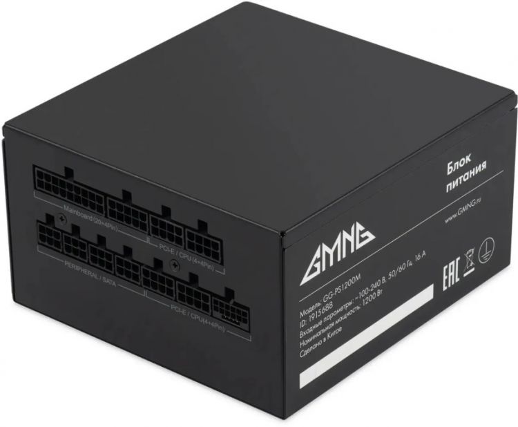Наименование модели: GMNG Блок питания GG-PS1200M 1200W, APFC, 80+ platinum, 120mm fan, 9xSATA, full cable management (ATX 12V 3.0), RTL
