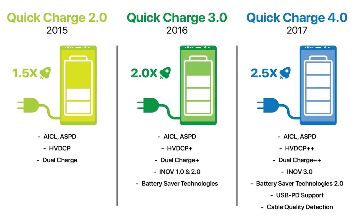 Кроме того, в смартфонах с QC 2.0 могут быть установлены сразу два контроллера питания PCIM для параллельной зарядки и снижения тепловыделения. Блоки питания Quick Charge 3.0 способны выдавать мощность 27-36 Вт, но для них определенно необходим кабель USB Type-C (в то время как QC 2.0 также может работать через microUSB). Версия 4.0 мощностью 45 Вт уже совместима с технологией Power Delivery, которая позволяет заряжать как смартфоны, так и ноутбуки от одного блока питания. Дальнейшее развитие QC 5.0 направлено на увеличение скорости зарядки до 100 Вт.