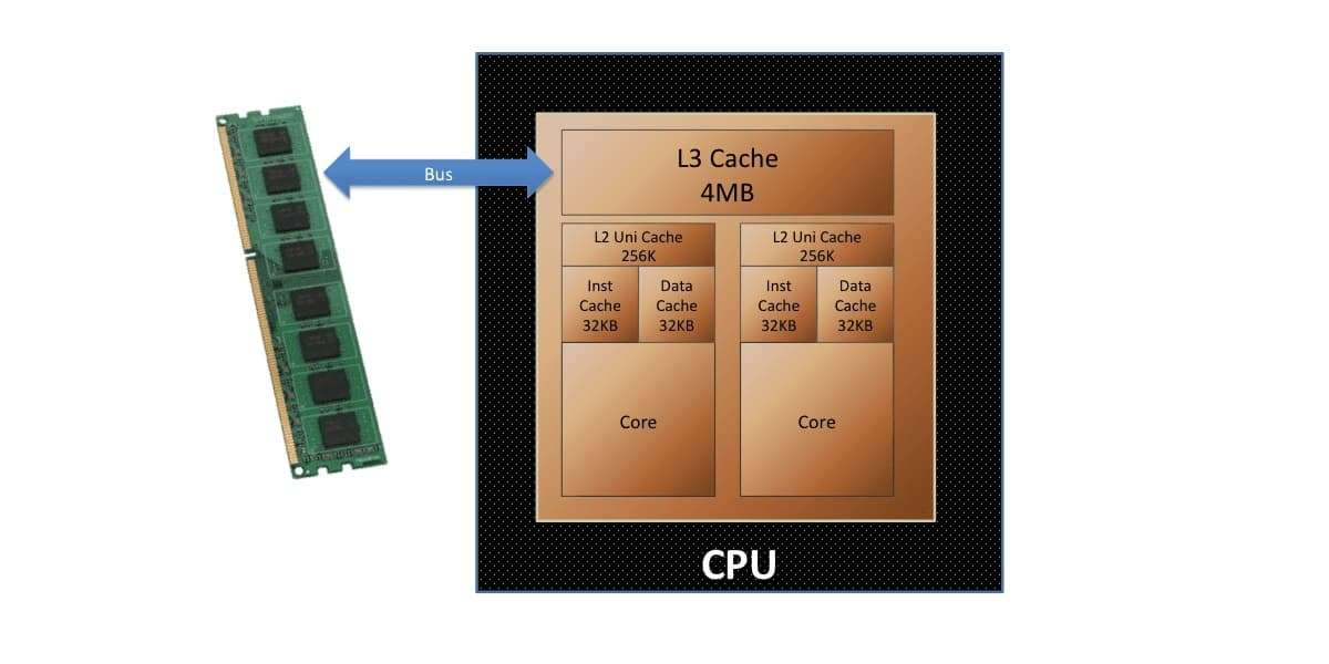 На количество исполняемых процессором инструкций за такт влияет не только эффективность вычислительных блоков, но и работа подсистемы памяти. В современных чипах обязательно имеется несколько видов кэша и промежуточные буферы. Каждый из уровней от L0 до L3 призван ускорять работу в рамках своей зоны ответственности — определенного вычислительного этапа.